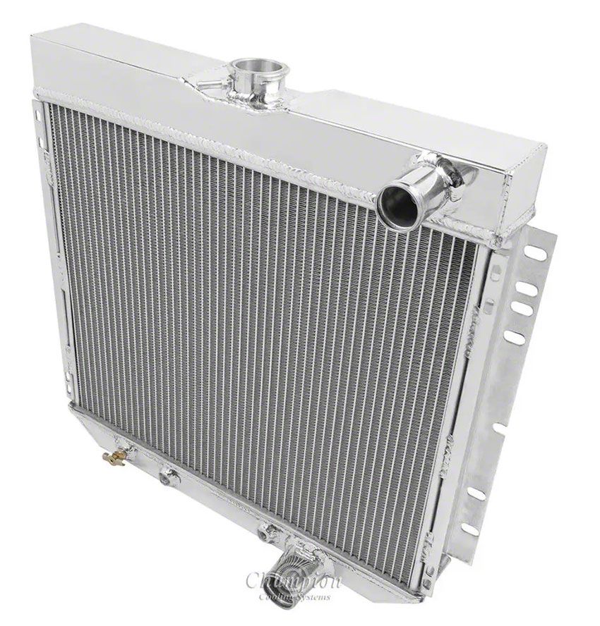 Your classic Ford Mustang can get hot... really hot! Driving and idling in traffic on 90+ degree summer days can push your stock cooling system to its limits... and beyond. Factory brass radiators are barely satisfactory at transferring heat, which is why they overheat when you least expect it. Why take chances with your valuable engine? Step up to Champion's all-aluminum, high efficiency radiator. Aluminum alloy is a far superior metal to the original equipment copper-brass construction because it dissipates heat much more quickly and cools down much more rapidly. Heat transfer from your engine to the atmosphere is greatly increased, thereby lowering the temperature of the engine coolant dramatically. An aluminum radiator will out-cool a copper/brass radiator of simi