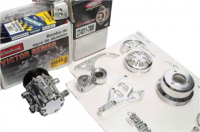 - Kit Includes: Polished Sanden Air Conditioning Compressor With Billet Manifold & Nose Cover, Aluminum Power Steering Pump With Billet Reservoir, Polished Aluminum Water Pump, Polished 105 Amp Alternator, Aluminum Crankshaft Pulley, Water Pump Pulley, Alternator Pulley With Cover & Power Steering Pump Pulley, Complete Aluminum Bracket Set For Alternator, Air Conditioning Compressor & Power Steering Pump, Belt Tensioner, Chrome Plated Installation Hardware & Goodyear Gatorback Belt