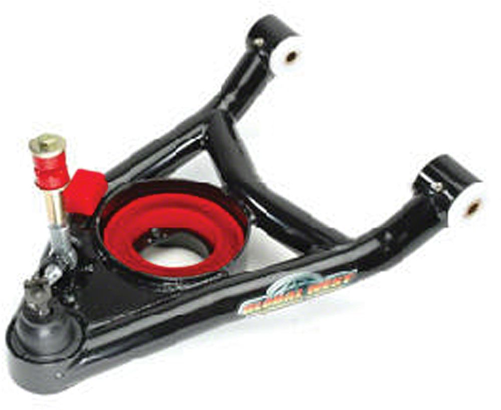 These tubular lower arms are perfect for stock or performance suspension upgrades. The arms are supplied with ball joints, bump stops, control arm bushings, special sway bar end links, and an innovative rotating spring cushion. The cushion acts two fold by offering isolation from road vibration and a proper indexing of the coil spring. Even if you trim your coil spring in order to lower the car, the lower spring cushion simply rotates for proper re-index. Additional header tube clearance is also achieved through the control arms compact design. These control arms are designed to provide excellent support around the spring, ball joint and bushing areas. Straps are utilized at the bushing locations while 3 separate tubes support the spring pocket. The sway bar mounting plate acts as a gusset
