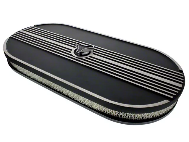 Dress up your Mustang's engine with this beautiful retro-style oval aluminum air cleaner from MAC's. It features a durable black finish with a partially-finned top for a clean, custom look. This air cleaner will fit most stock and aftermarket carburetors with a 5-1/8" diameter neck like most Carter, Edelbrock, Holley, Rochester, and Quadrajet four barrel carburetors. It also has a raised aluminum base to position the air cleaner above the carburetor flange. Each air cleaner comes with a die-cast and chrome plated 3-wing nut and mounting hardware for installation.