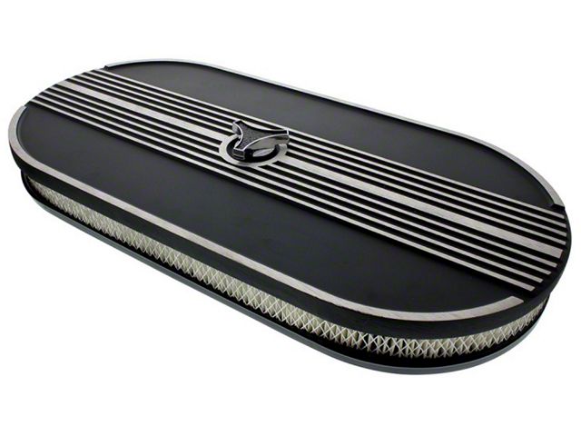 Dress up your Mustang's engine with this beautiful retro-style oval aluminum air cleaner from MAC's. It features a durable black finish with a partially-finned top for a clean, custom look. This air cleaner will fit most stock and aftermarket carburetors with a 5-1/8" diameter neck like most Carter, Edelbrock, Holley, Rochester, and Quadrajet four barrel carburetors. It also has a raised aluminum base to position the air cleaner above the carburetor flange. Each air cleaner comes with a die-cast and chrome plated 3-wing nut and mounting hardware for installation.