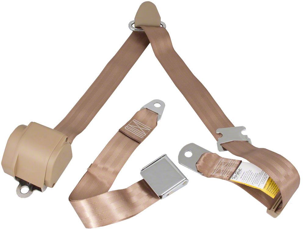 Add a little safety to your classic Mustang without sacrificing its classic look with these 3-point seat belt kits. Available in 10 colors to match a variety of Mustang interiors, these belts look right at home with chrome aviation-style buckles and chrome belt ends. Inertia design retractors lock during sudden stops or accidents, and are color matched to the belt webbing or your choice. The buckle end of each belt consists of 28 inches of webbing and the retractor side has 135 inches of webbing. Grade 5 hardness mounting hardware and a detailed installation manual are included in this package that is complete for 2 seats. This Mustang seat belt kit meets or exceeds federal motor vehicle safety standards.