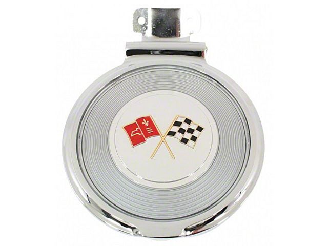 The fuel door emblem features the Chevrolet crossed flags on a white to silver white background with a silver ring. The flags are contained in a distinct silver circle and the flags within silver circle are approximately half the size of the 1963 flags. Concentric silver rings surround the silver circle. They extend outward from the silver circle to perimeter of the chrome fuel door frame. Silver concentric circles are 1" wide and surround the flag embl