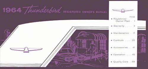 Owner's manuals are correct reprints of the original manual that was included with the car. They are a tremendous resource for information about your Thunderbird and are great for displaying at car shows. Each manual covers everything from driving the car to its maintenance. These manuals are also attractive for the collector.