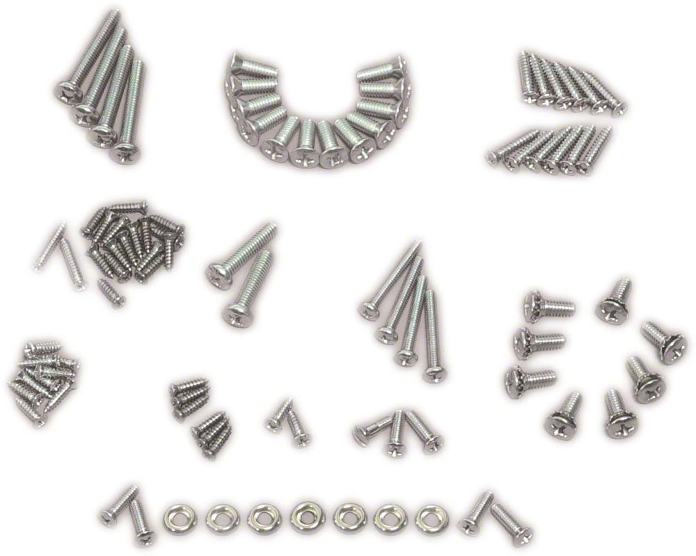 Construction and Appearance. This screw set is crafted from high-quality raw metal, offering excellent durability and a professional appearance. The comprehensive set includes screws for the sun visors, sill plates, inside mirror support-header, shift console, dash insert, seat bumpers, steering wheel mounting, convertible top rear latches, glove box liner, door panel clips, radio side panels, rear quarter panel trim, kick panels, headlamp open switch mounting, windshield interior molding, and armrest screws and washers. Built to original equipment specifications, this set ensures reliable performance and long-lasting functionality.