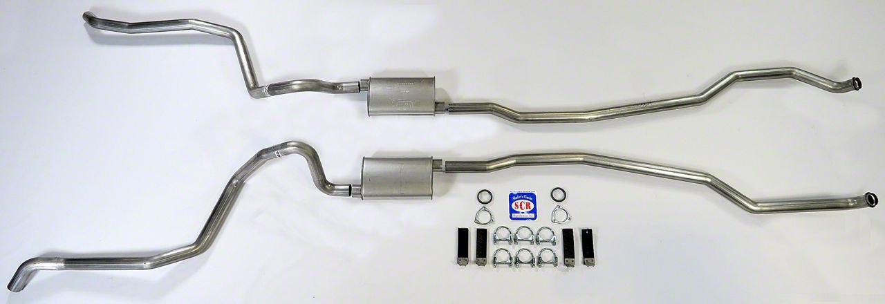 1965-66 Chevrolet 2-1/2" dual turbo exhaust system for big block with hi-performance manifolds. Tailpipes turn down at bumper. Clamps and hangers included. Comes with turbo mufflers.
