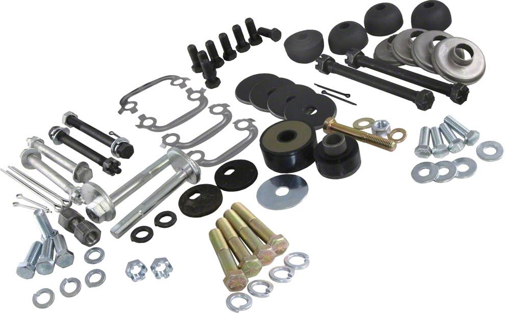 Complete rear suspension mounting kit includes: rear spring mounting kit, rear spring mount bolts, upper and lower rear end mount cushions, differential carrier bolt set, trailing arm bolt set, shock bracket/strut arm nuts and clips, differential front bolt set, differential front bracket bolt set, french locks, french lock bolt set, spring anchor bolt set, trailing arm cotter pins and strut rod adjustment assemblies.
