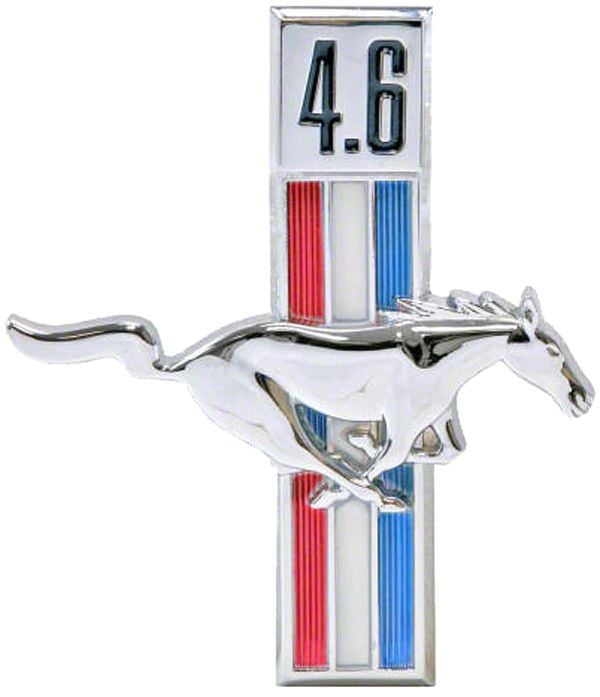 Now available! 65 & up Running Horse Emblems are now available with 5.0 or 4.6 engine designations. These emblems feature a high-quality chrome finish, and correct color shades in the tri-color bar. Each emblem is available in right or left facing versions. Includes fasteners.