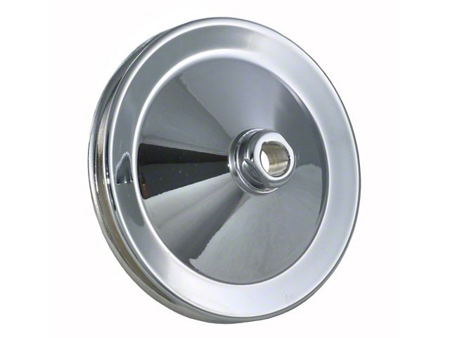 Chrome Power Steering Pulley. This Power Steering Single Groove Pump Pulley is designed for small block engines and models without air conditioning, providing an ideal solution for repair and restoration projects. With an outside diameter of 6 1/8 inches, this pulley ensures reliable OEM-quality performance and is built to seamlessly integrate with factory parts.