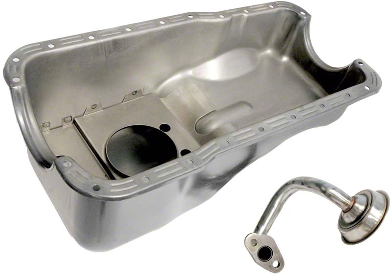 For Mustang 260/289/302 engines, this kit, from Scott Drake, includes our popular small block oil pan (unpainted) with the same design of baffle used in the Boss 302, and Boss 302 style oil pickup tube. Reduces the possibility of oil starvation during extreme driving.