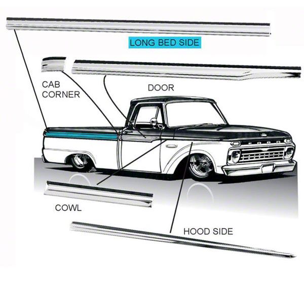 These quality reproduction mouldings have the original bright metal finish. They fit long wheelbase F100 and F250 trucks made from 1965-1966. Mounting clips are included for installation..