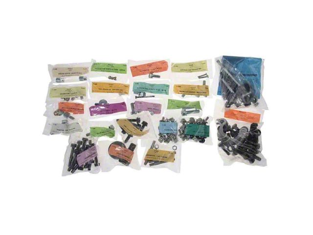 Engine hardware master kits include OEM style hardware to attach the following items: Air Cleaner, Exhaust Manifolds, Oil Filter Adapter, Carburetor, Fuel Pump, Oil Pan, Crankshaft Pulley, Heat Shroud, Timing Cover, Distributor, Ignition Coil, Valve Covers, Engine Tag, Intake Manifold, Water Neck & Water Pump.