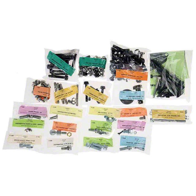 Engine hardware master kits include OEM style hardware to attach the following items: Air Cleaner, Exhaust Manifolds, Oil Filter Adapter, Carburetor, Fuel Pump, Oil Pan, Crankshaft Pulley, Heat Shroud, Timing Cover, Distributor, Ignition Coil, Valve Covers, Engine Tag, Intake Manifold, Water Neck & Water Pump.