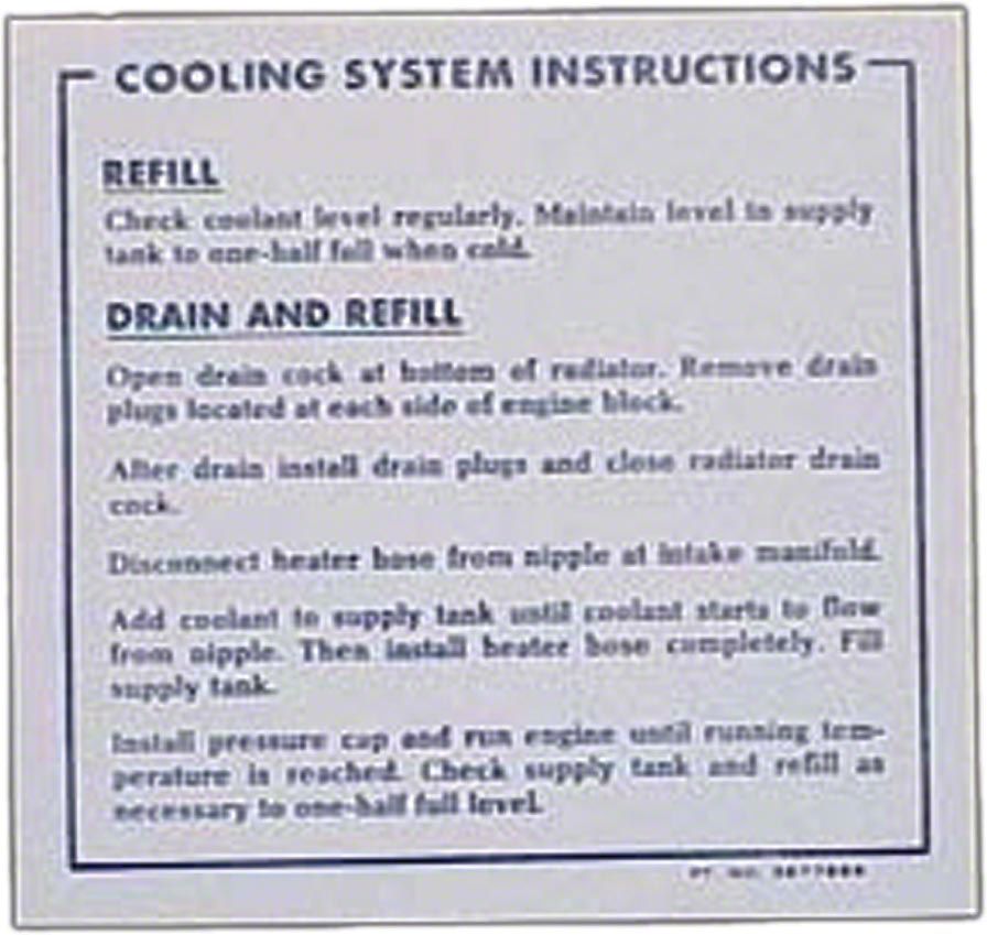 This Corvette reproduction cooling system warning decal has been manufactured to original factory specifications using today's modern manufacturing techniques. You will find the fit, finish and function will work superbly for your restoration. In addition, using a reproduction cooling system warning decal from Eckler's will add authenticity and value to your Corvette.
