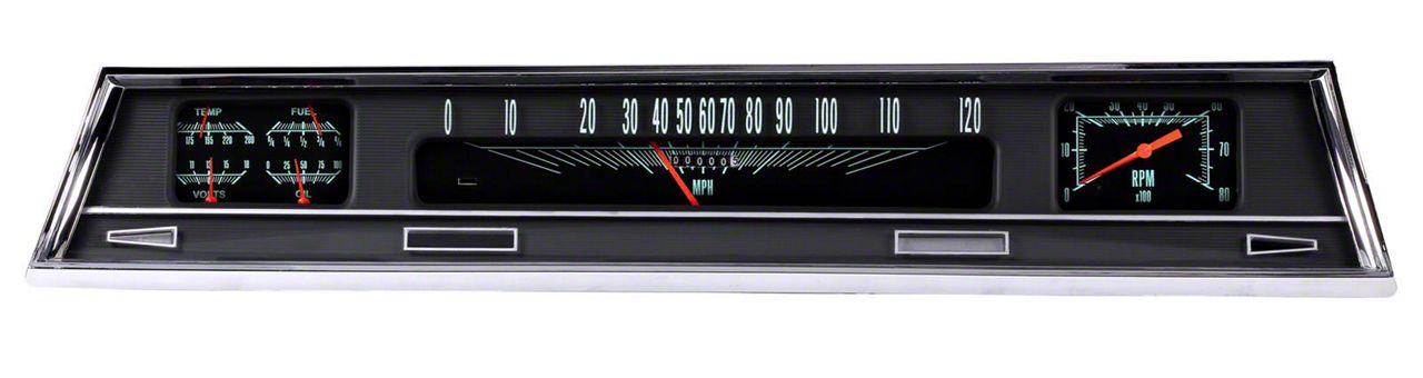 Classic Instruments 1966-67 Chevelle package gauge sets feature a speedometer and tachometer, along with fuel, oil, temperature, and volt gauges. The all-electric cluster arrives ready to install directly into the stock dash with ease. Additionally, the turn signals and high beam indicator are in the stock locations, and the panel also features a built-in shift light and warning light. Everything needed to install the direct-fit package is provided in the kit, including all necessary sending units.
