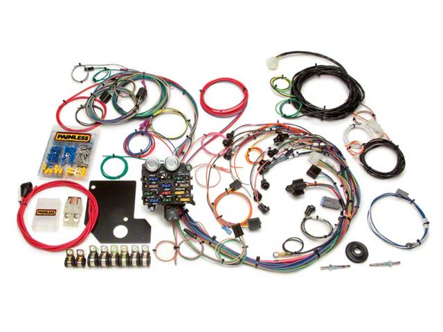 This 21 circuit direct fit wiring harness has many of the factory connectors already installed on the harness out of the box for your 1966 or 1967 Chevy II or Nova. Including: the headlight connectors & switch, fuel gauge connnector, dimmer switch, brake switch, heater switch, blower resistor, wiper switch, backup switch, horn, dash light sockets, and warning light sockets. This harness is split into three sections (engine, dome light, & rear) for easy installation and troubleshooting. You'll also find in this kit a harness for the factory air, a high output alternator pigtail with the connector installed, two door jam switches, 12 instrument panel light bulbs, eight harness mounting clamps, a custom Painless mounting plate for t
