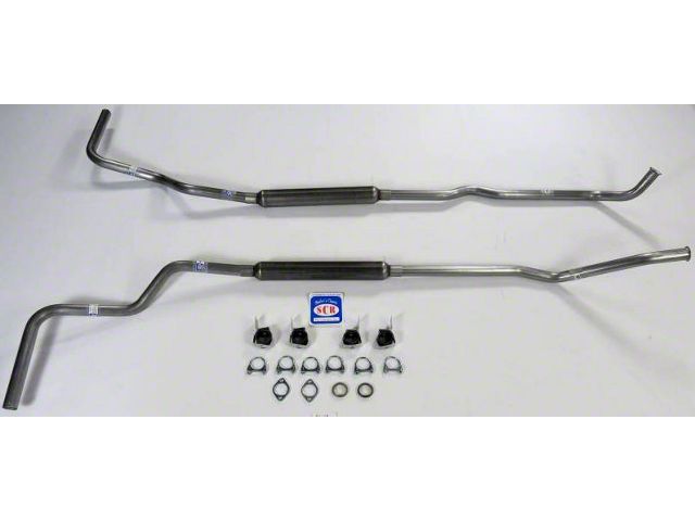This system fits 1966-1974 Bronco's. It features the original pipe bends, muffler shape, and location. Unlike the original, ours has aluminized pipes with mandrel bends and turbo muffler. This configuration produces a performance throaty tone without drone at cruising speed. It works with original hangers (not included), but you can purchase universal hangers from us or locally. This is an extremely high-quality exhaust system. You would be hard-pressed to find a local exhaust shop that could produce something close for any price. The best part is you should never need another exhaust system, no matter how your choose to use your Bronco.