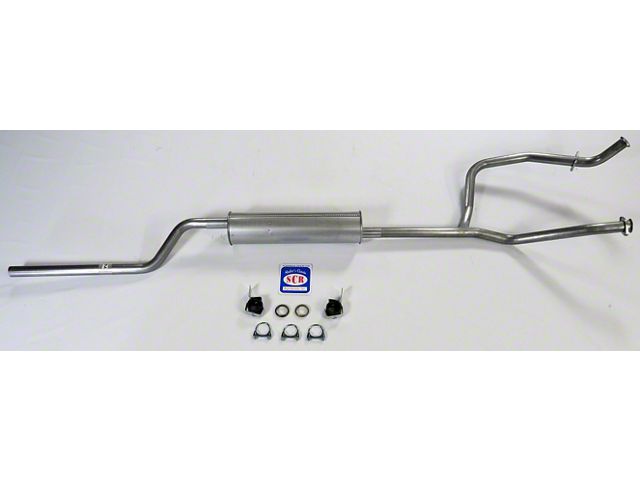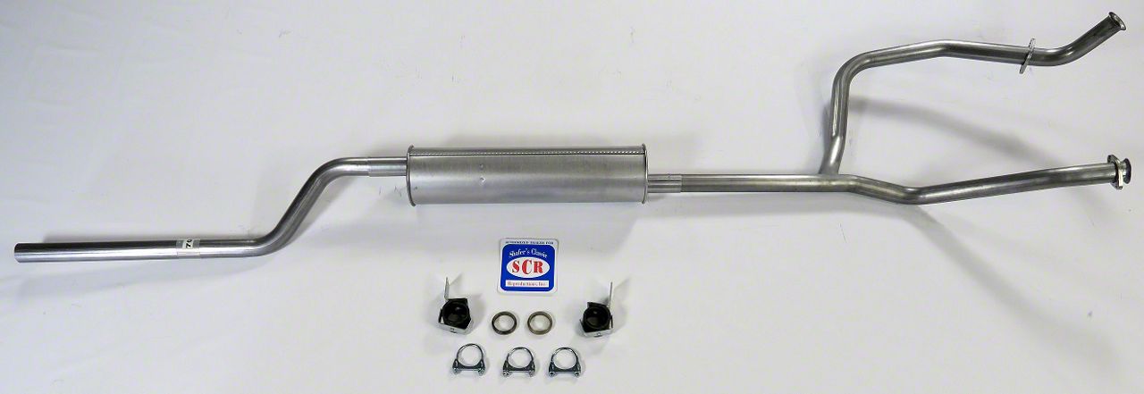 This system fits 1966-1974 Bronco's. It features the original pipe bends, muffler shape, and location. Unlike the original, ours has aluminized pipes with mandrel bends and turbo muffler. This configuration produces a low, throaty tone without drone at cruising speed. It works with original hangers (not included), but you can purchase universal hangers from us or locally. This is an extre