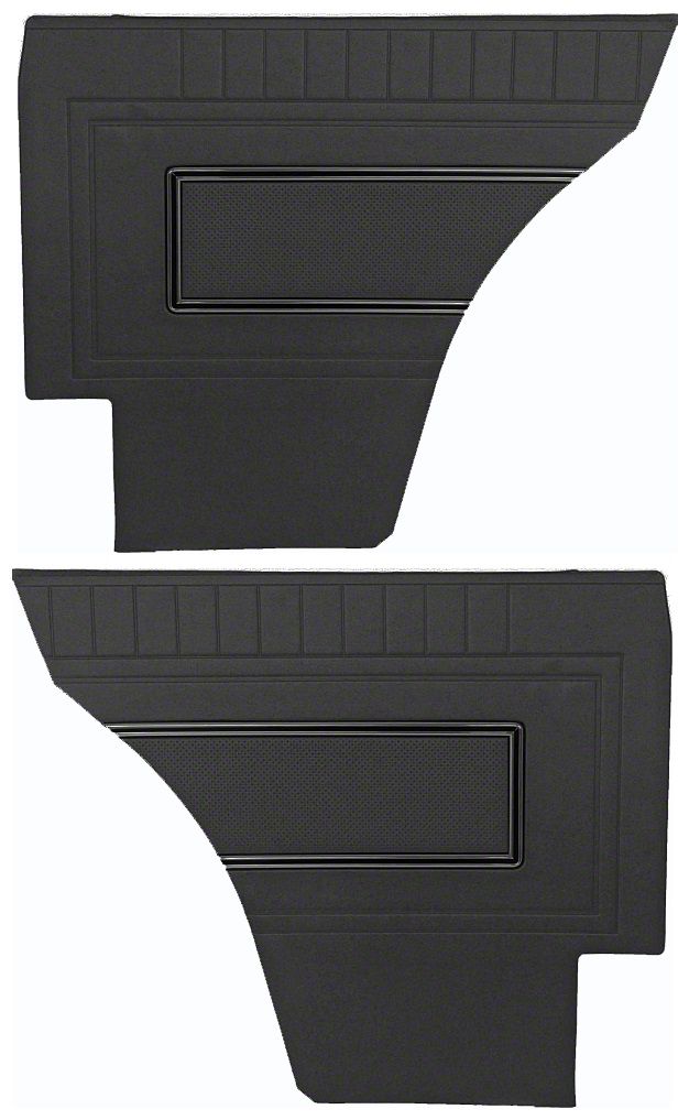 This pair of rear side panels features the two correct grain black vinyls. They have the proper die-stamped patterns and matched factory contour lines as well. This is all permanently attached to die-cut inner boards for proper fit and appearance. We also offer the fronts individually, and a full front and rear set. That is the best option for a quality job.