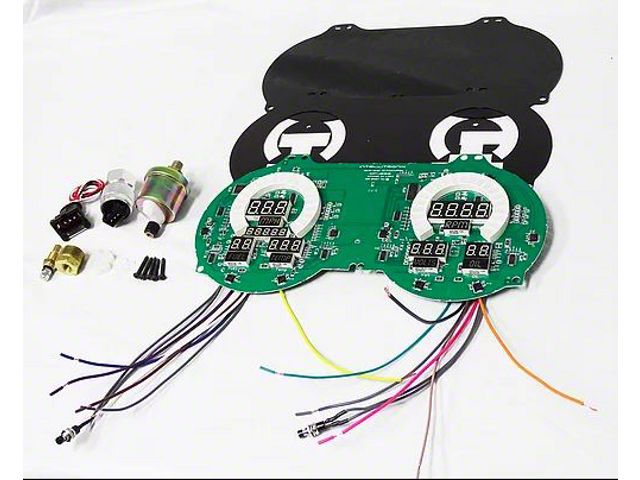 Impress your friends with this stunning 1967-1968 Camaro / Firebird LED Digital Dash its sweeping gauges. The 1967-1968 Camaro / Firebird LED Digital Dash comes complete with direct fit printed circuit board, custom fit "smoked" plexiglass faceplate, universal sending units for water temperature S8013, oil pressure S8434, speedometer S9013 for cars without electronic transmission or cruise control, and hardware kit. Everything directly fits into your existing housing, but you may need to run some new wires to the speed sensor. Available in R(Red), G(Green), B(Blue), or W(White).