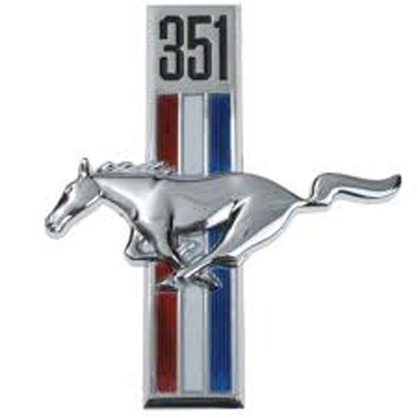 Great attention to detail and high standards for quality can be seen within this Running Horse Emblem. Features the correct color shades in the tri-color bar. Includes fasteners with custom 351 engine designation.