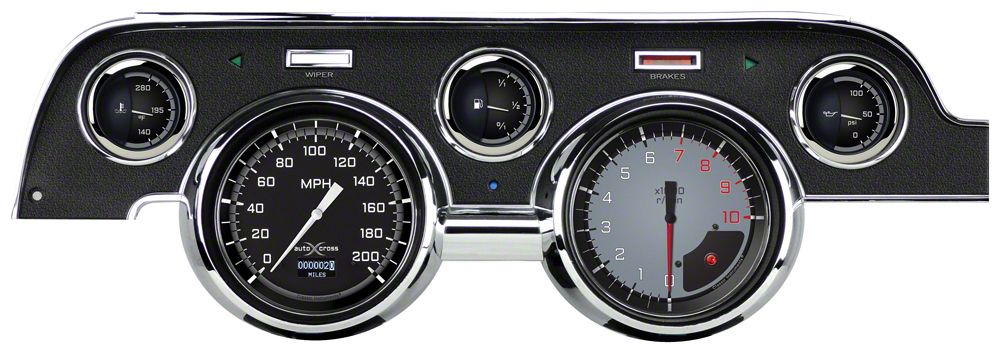 This 1967-68 Mustang package with AutoCross series gauges installed features a 4-5/8" information screen speedometer, a tachometer, and 2-1/8" fuel (75-10 OHM), oil, and temp gauges. The cluster is completely assembled and mounted in a standard black camera case or brushed aluminum OEM-style bezel. The unit is pre-wired and includes all necessary sending units, mounting hardware, and a wiring harness constructed of automotive grade TXL wire, machine-crimped terminals, tech-flex sleeving, and Molex main connectors. Equipped with Classic Instrument's ZST and works directly with ECM or VSS signal, no need for an additional control box.