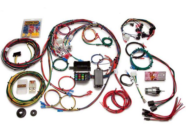 This Painless Performance chassis harness features a fully assembled fuse block with modern fuses and includes the following: Wiring for A/C and Heat, cigarette lighter, accessory relay, backup lights, brake lights, charging, courtesy/dome lights, electric choke, emergency flashers, fan relay power, fused p