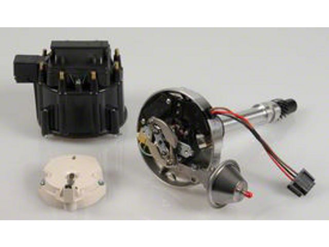 Designed to meet the high performance demands of racing competition, these units fit Chevy small block and big block engines. These 100% NEW distributors have all the reliable components of the 66940, but they also include a highpower 50,000 volt coil. This high-performance distributor produces a 50,000 volt spark through 7,500 RPM with true spark alignment for instantaneous response, a high performance curve, a premium cap with brass terminals, and a low-saturation ignition module. All have die-cast aluminum housings, polished to a brilliant billet-look appearance.