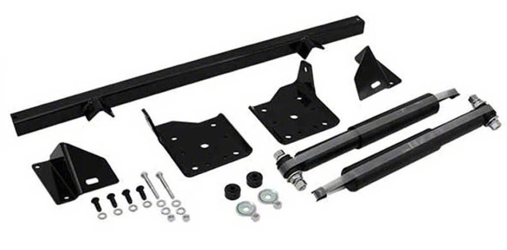 Rear shock relocation kit for 1967-69 Camaros . This kit reconfigures the F-body rear shock absorbers from staggered to non staggered, providing additional tire and exhaust clearance and increased shock travel. Relocating the rear shocks inboard also eliminates the disc brake clearance problems associated with staggered shocks.