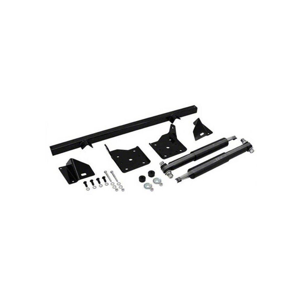 Rear shock relocation kit for 1967-69 Firebirds. This kit reconfigures the F-body rear shock absorbers from staggered to non staggered, providing additional tire and exhaust clearance and increased shock travel. Relocating the rear shocks inboard also eliminates the disc brake clearance problems associated with staggered shocks.