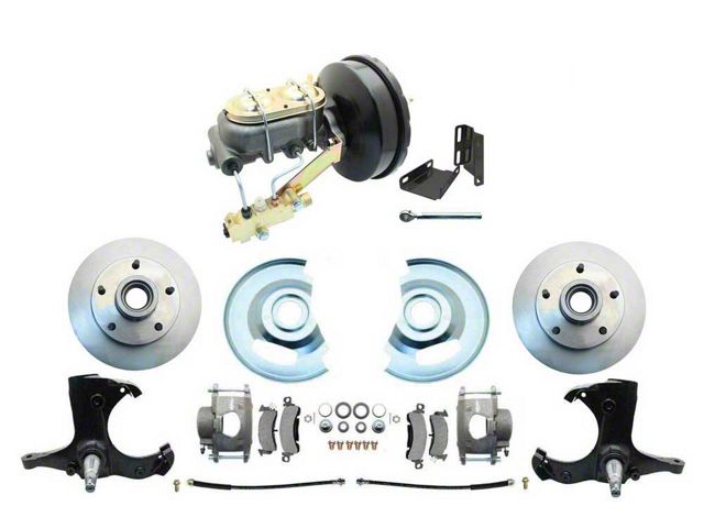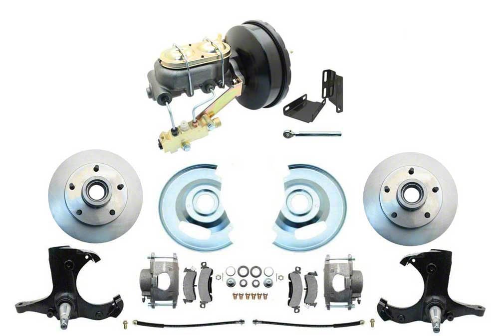 Complete power disc conversion kit from MBM Brakes. Designed for 1967-70 Chevy C-10s. Includes stock height spindle set with 5-lug rotors, bearings, seals, hardware, and loaded calipers! Also includes the 9" dual power brake booster, master cylinder and proportioning valve kit!