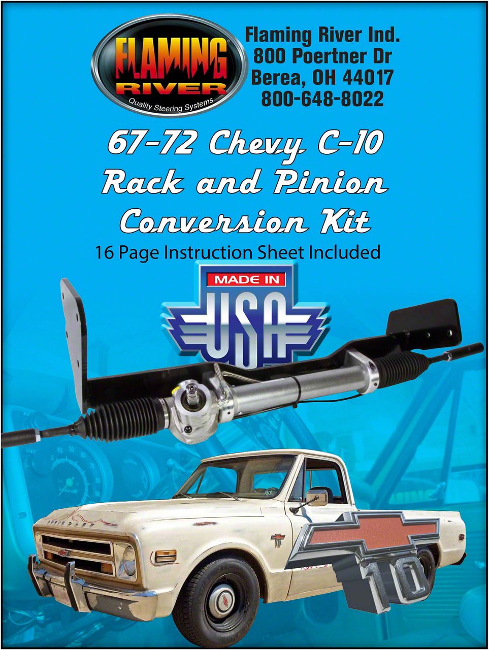 Flaming River's new bolt-in rack and pinion cradle from Eckler's Trucks converts both power and manual steering systems. This unique new style of steering system utilizes the original inner and outer tie rod ends. This makes for simple installation and maintains the original pivot position. No cutting, welding or drilling to the chassis-it bolts into the existing steering box holes. Easily converts this steering box application to rack and pinion steering without any modification.