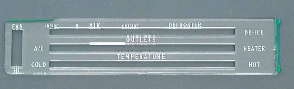 Eckler's Truck reproduction heater control lenses are made to correct specifications using only the highest manufacturing techniques to ensure you get a part authentic to the day your truckwas made. High quality acrylic plastic is injected in molds made on modern CNC machines to ensure maximum fit over original handmade tooling. Then our heater control panel lens is pad-printed with correct font & color.