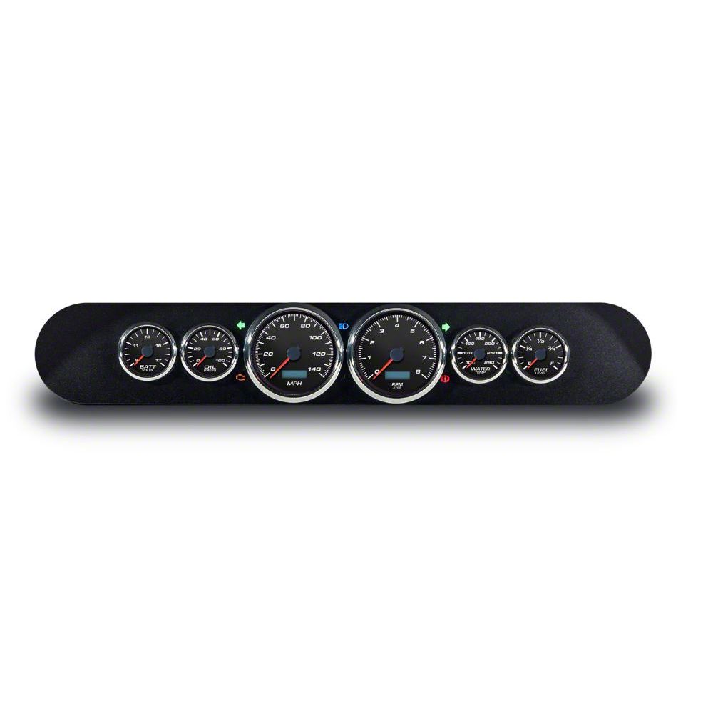 6 gauge kit components: 3-3/8" speedometer 0-140 MPH, 3-3/8" tachometer 0-8,000 RPM ,Fuel gauge with user selectable ranges: 0-90 (GM), 73-10 (Ford), 240-33 (universal), 16-158 (Ford late) ,Water temperature gauge ,Oil pressure gauge ,Voltmeter ,Bushing kit ,Programming button ,Spin-on back-clamps ,Wiring harnesses ,Temperature sender ,Pressure sender