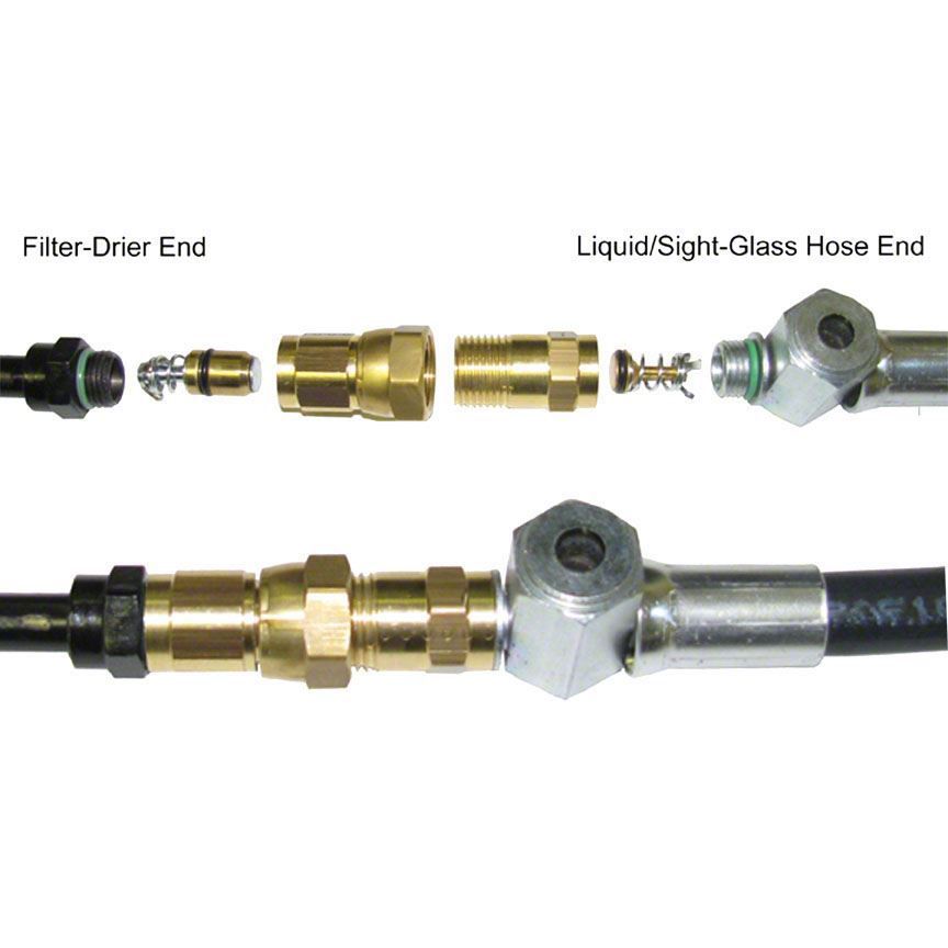 - This two-piece quick-disconnect assembly installed between the stock 90' liquid fitting and the rear liquid/sight-glass hose. NOTE - This part is not used w/Original Air's reproduction liquid/sight-glass hose, part #13-104 or #13-161. Original Ford part #'s C1SZ-19B595-A/YF-252 Male end & C1SZ-19B596-A & YF-241 Female end.