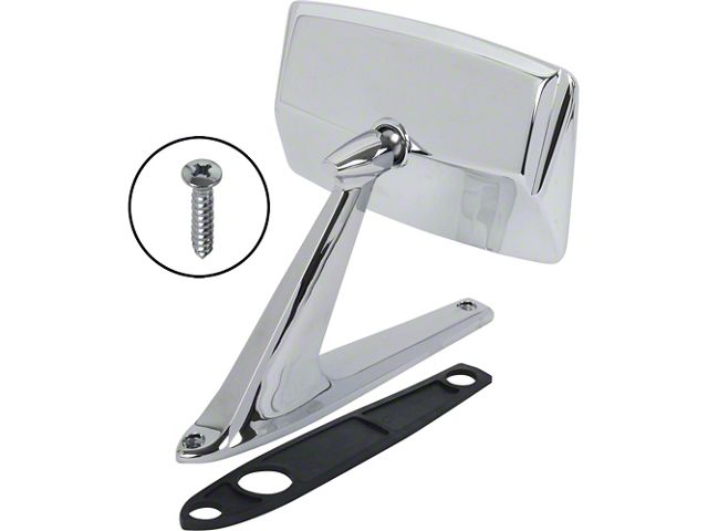 This mirror will fit either the left or right side of the car, and the base pad is included. Chrome with rectangular head, manual control. Concours correct for 1967-1968 Mustang, will fit 1969-1973 models as well. Sold each.