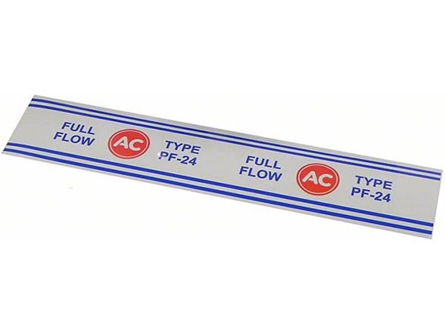 Here is a way to get an original look without breaking the bank. This clear decal matches the design of original AC PF24 oil filter graphics. This decal can be applied to any plain white oil filter. The end result is it looks like you spent big money on a reproduction oil filter. Many who do buy the whole reproduction filter tend to change their filter less frequently resulting in less protection for their engine. Order this great decal and make that show judge smile!