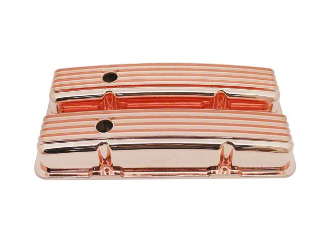 Chevy small block full finned copper aluminum valve covers fit 1958-86 Chevy 283-305-327-350-400 small block engines. They are baffled and short (OEM) style. There is one hole in each cover. Height 2-9/16".