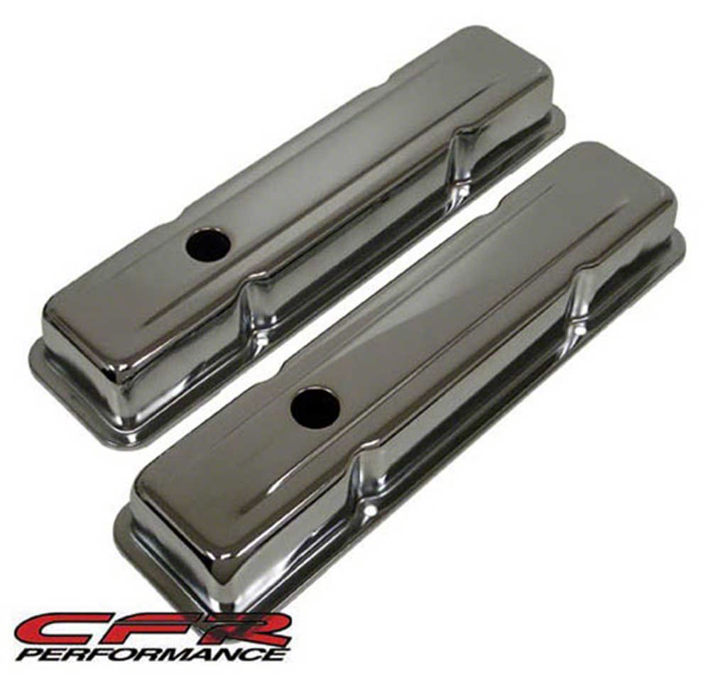 Chevy small block short chrome steel valve covers fit 1958-86 Chevy 283-305-327-350 small block engines. They are baffled and short (OEM) style. There is one hole in each cover. Height: 2-5/8 ".