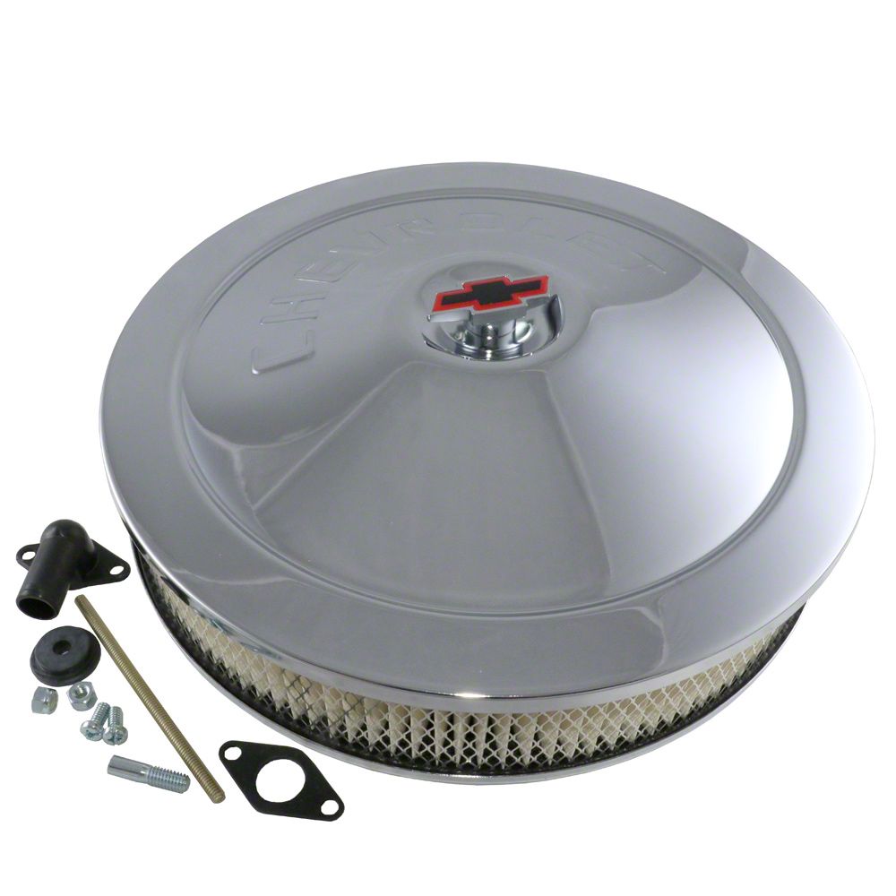 Air filters such as the Camaro Air Cleaner Assembly, Open Element, 14", Chrome, With Chevrolet Word, brought to you by Rick's Camaro, are intended to keep the engines clean and parts running smoothly for 1967-1992 model Chevrolet Camaros. Without a working air cleaner assembly, driving your 1967, 1968, 1969, 1970, 1971, 1972, 1973, 1974, 1975, 1976, 1977, 1978, 1979, 1980, 1981, 1989, 1990, 1991, or 1992 Camaro can be both uncomfortable and detrimental to the life of your car. Includes genuine GM air cleaner filter, hardware and hi-tech wing nut shown. Top and base chromed and coated to exact OEM specifications. Lid embossed with lettering "Chevrolet". Always choose quality, choose Rick's Camaro for superior restoration, and performance products!