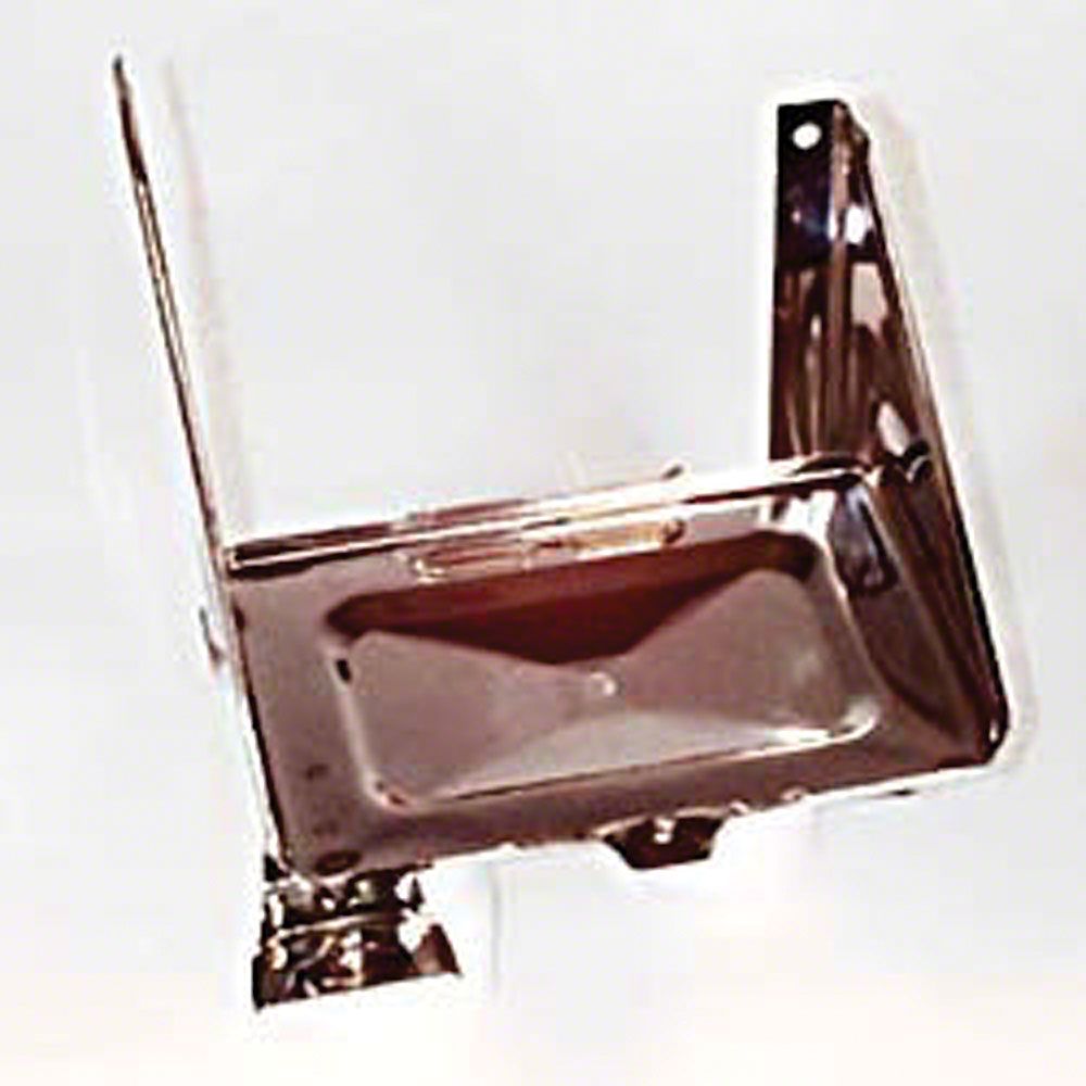 All factory bends and holes have been included in this excellent reproduction of the original. The battery tray assembly bolts to the fire wall through predrilled holes. Drain holes are also drilled in the tray. Polished stainless finish is very shiny, giving it a long-lasting "chrome" look. Hold down and hardware sold separately
