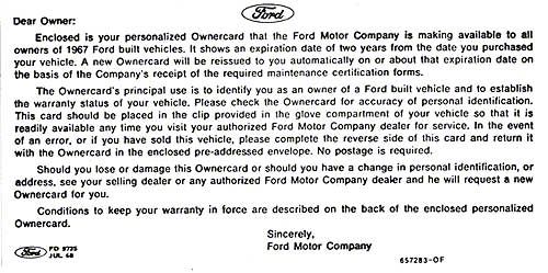 Personalized Warranty Card Instruction Sheet (1967 Mustang)