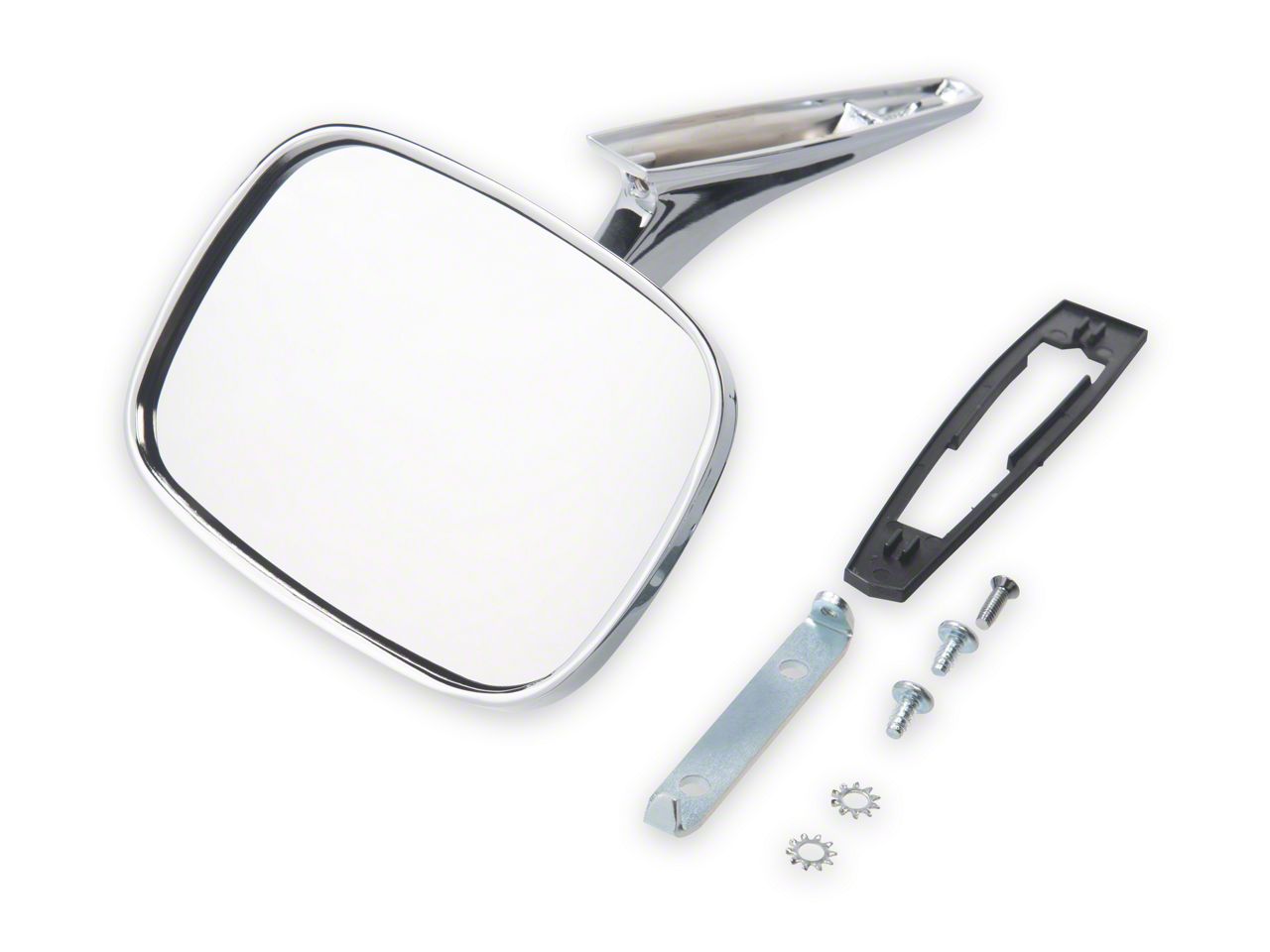 Construction and Appearance. The Scott Drake Outside Door Mirror features durable construction with a bright hard chrome finish that enhances the vehicle's exterior appearance while offering resistance to corrosion. Its factory style mirror housing and show correct reproduction design accurately replicate the original component for a period-correct restoration look. Manufactured by Scott Drake, this mirror reflects high-quality craftsmanship and attention to detail.