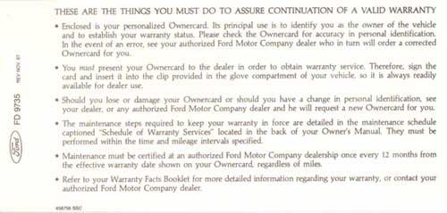 Ford Mustang Warranty Card Instruction Sheet - Personalized,- Through Early 1969