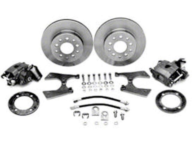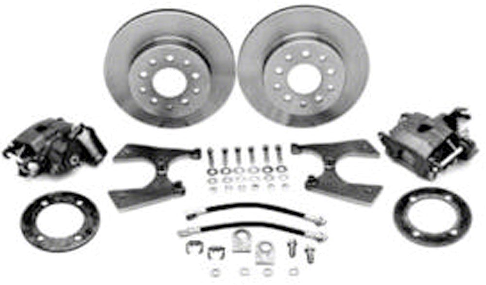 The rear system uses a 12" cross-drilled, gas slotted and zinc washed rotor that mounts to the factory axle with the longer studs supplied and mates up to a Lincoln Continental emergency brake style caliper mounted to the rear axle housing with a custom caliper mounting bracket. This kit includes all the bearings, seals, dust caps, brackets, cables, hoses, clips, instructions and necessary hardware to assure a hassle free installation