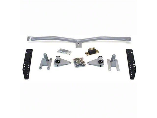 Frame mounts and transmission crossmember bolt-in to factory mounting holes, requiring no drilling or modifications