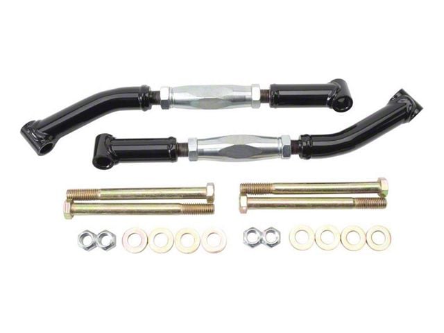 QA1 Adjustable Rear Frame Supports are engineered to improve handling, traction and all around suspension performance by eliminating unwanted chassis flex and reinforcing the upper and lower trailing arm mounts. Made from 1'' diameter cold rolled steel tubing, they feature zinc plated adjustable threaded sleeves for adjusting the preload in the rear trailing arm mount after installation. Designed to clear stock and aftermarket mufflers and includes all of the necessary hardware for an easy installation