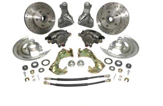 Drop spindle design lowers cars a full 2" without affecting the steering or suspension geometry. The unique design accepts factory ball joints and stock steering arms. Kit comes complete with 2" modular drop spindles, modified caliper mounting brackets, modified dust shields, loaded calipers, 11" rotors, bearings, seals, brake hoses and all mounting hardware