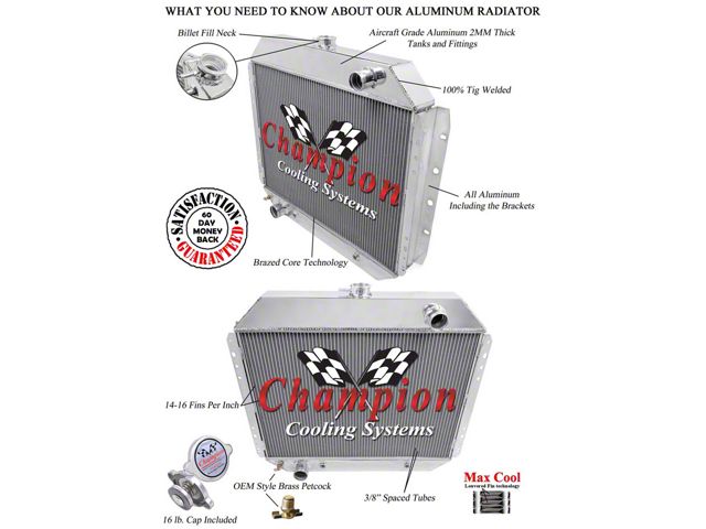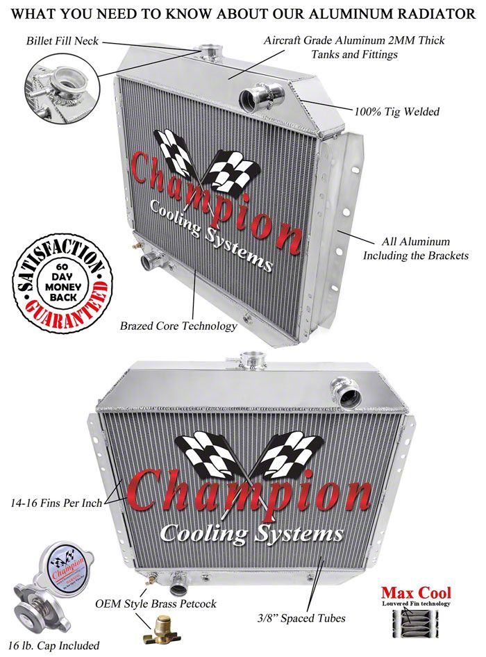 Your classic Ford can get hot... really hot. Driving and idling in traffic on 90+ degree summer days can push your stock cooling system to its limits... and beyond. Factory brass radiators are barely satisfactory at transferring heat, which is why they overheat when you least expect it. Why take chances with your valuable engine? Step up to Champion's all-aluminum, high efficiency radiator. It's aluminum alloy construction is far superior to the original equipment copper-brass radiator because it dissipates heat much more quickly and cools down much more rapidly. Heat transfer from your engine to the atmosphere is greatly increased, thereby lowering the temperature of the engine coolant dramatically. An aluminum radiator will out-cool a copper brass radiator of similar siz