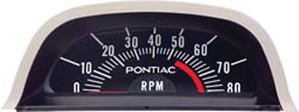 This high-quality reproduction tachometer will replace the original exactly and offer years of continuous service. It is manufactured with a tightly sealed case to keep moisture out, which means less corrosion of internal parts and long lasting dependability. Includes 2 bulbs for clearer visibility than the original, plus the correct Pontiac lettering for an authentic look. Officially Licensed by General Motors.